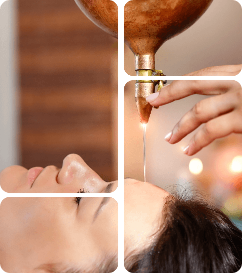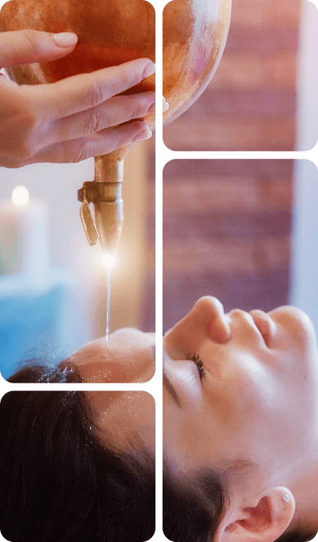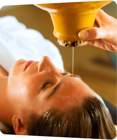 Ksheer Dhara uses milk infused with herbs. The medicated milk is poured over the head, and it is helpful in Vata and Pitta's predominant headaches, stress, and anxiety and helps nourish and relax the body.